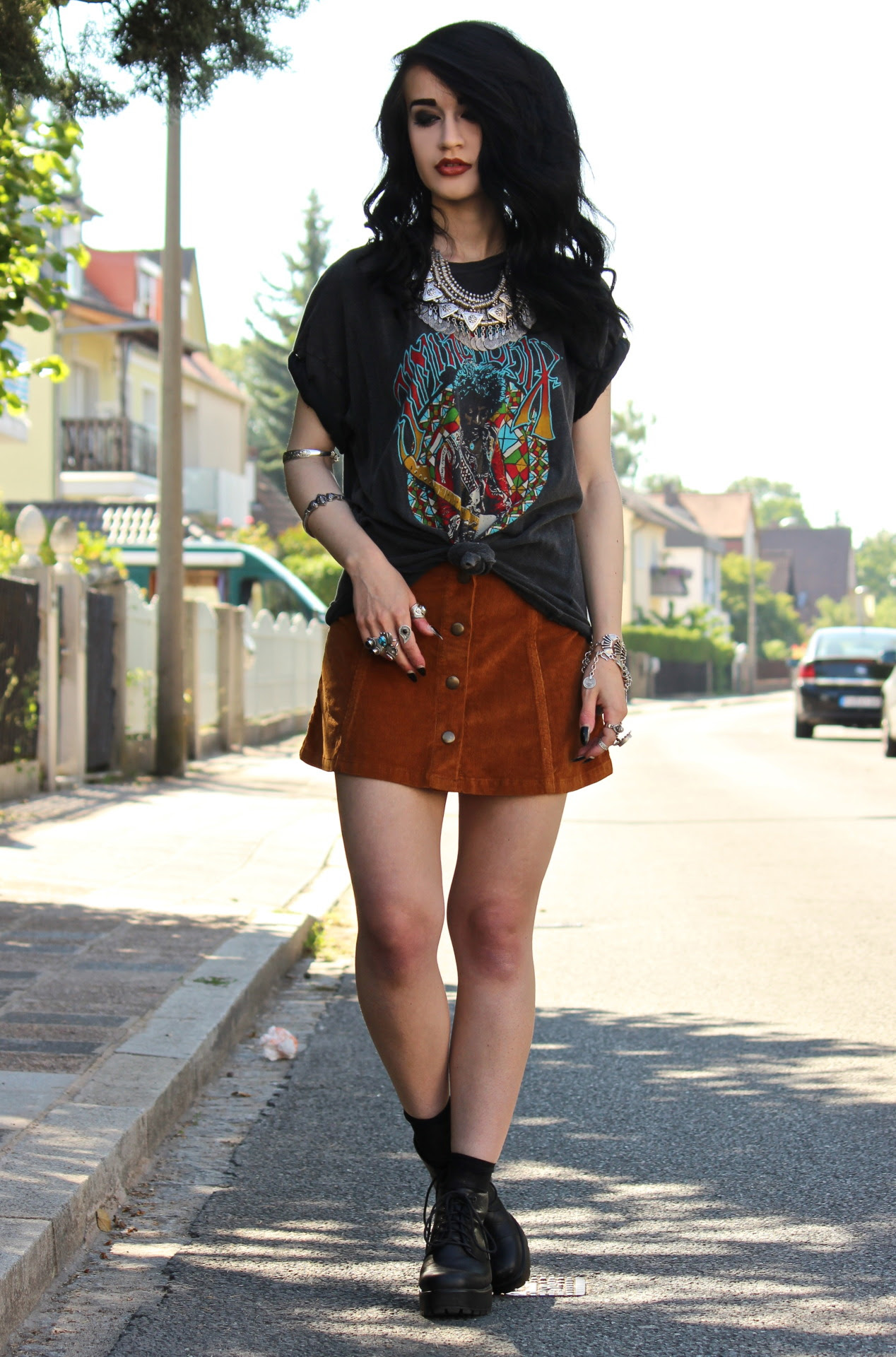Jimi hendrix tee: And Finally via Topshop || Buttoned cord A-line skirt: Topshop || Necklaces: Dixi || Boots: Vagabond